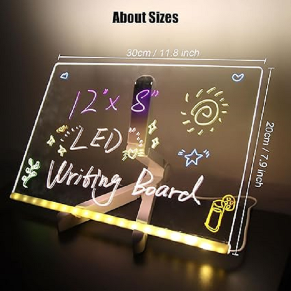 【لوح مسح جاف من الأكريليك مع ضوء】 حجم لوح الأكريليك 30*20 سم (11.8*7.9 بوصة) مع واجهة USB، 7 أقلام رسم ملونة، 1 حامل قابل للتعديل، 2 قطعة قماش للمسح. لوحة الملاحظات مصنوعة من مادة أكريليك متينة وقابلة لإعادة الاستخدام.