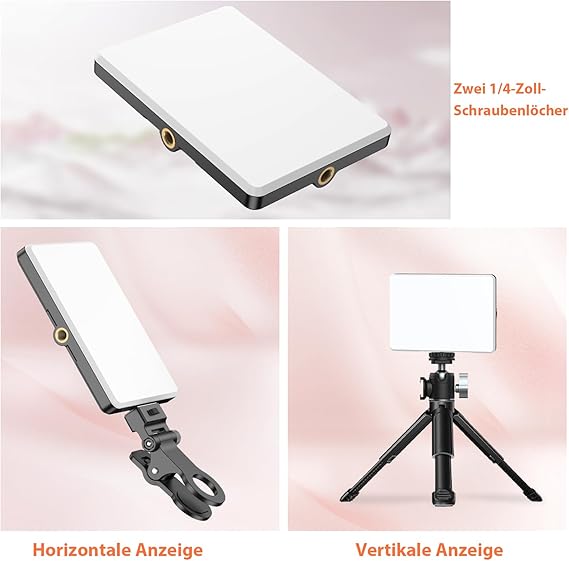 يحتوي مصباح كاميرا الهاتف المحمول على فتحتين للبراغي مقاس 1/4 بوصة ومشبك واحد. يمكنك تثبيته أفقيًا أو رأسيًا حسب الحاجة.